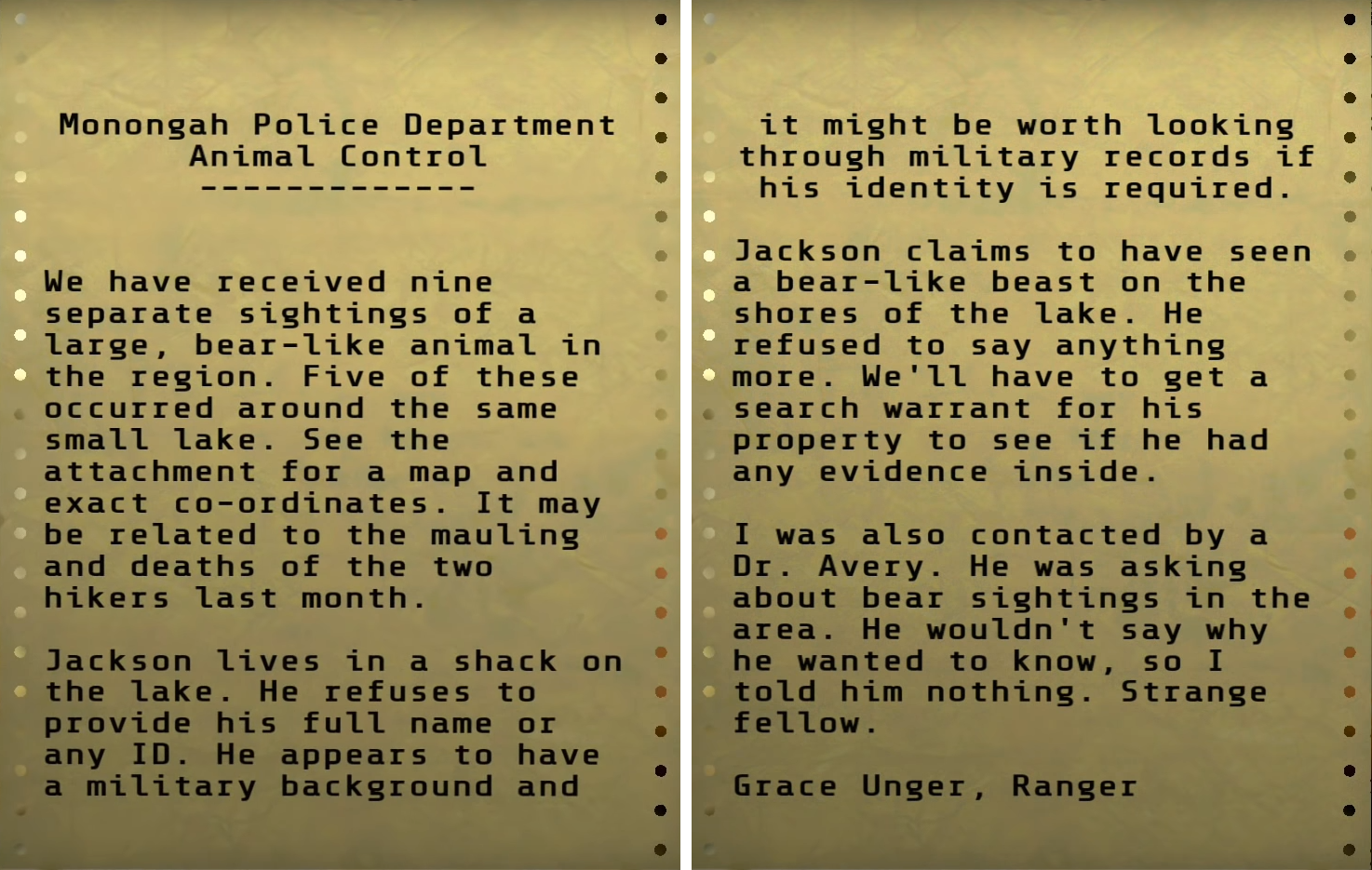 Jackson claims to have seen a bear-like beast on the shores of the lake. He refused to say anything more. We'll have to get a search warrant for his property to see if he had any evidence inside.