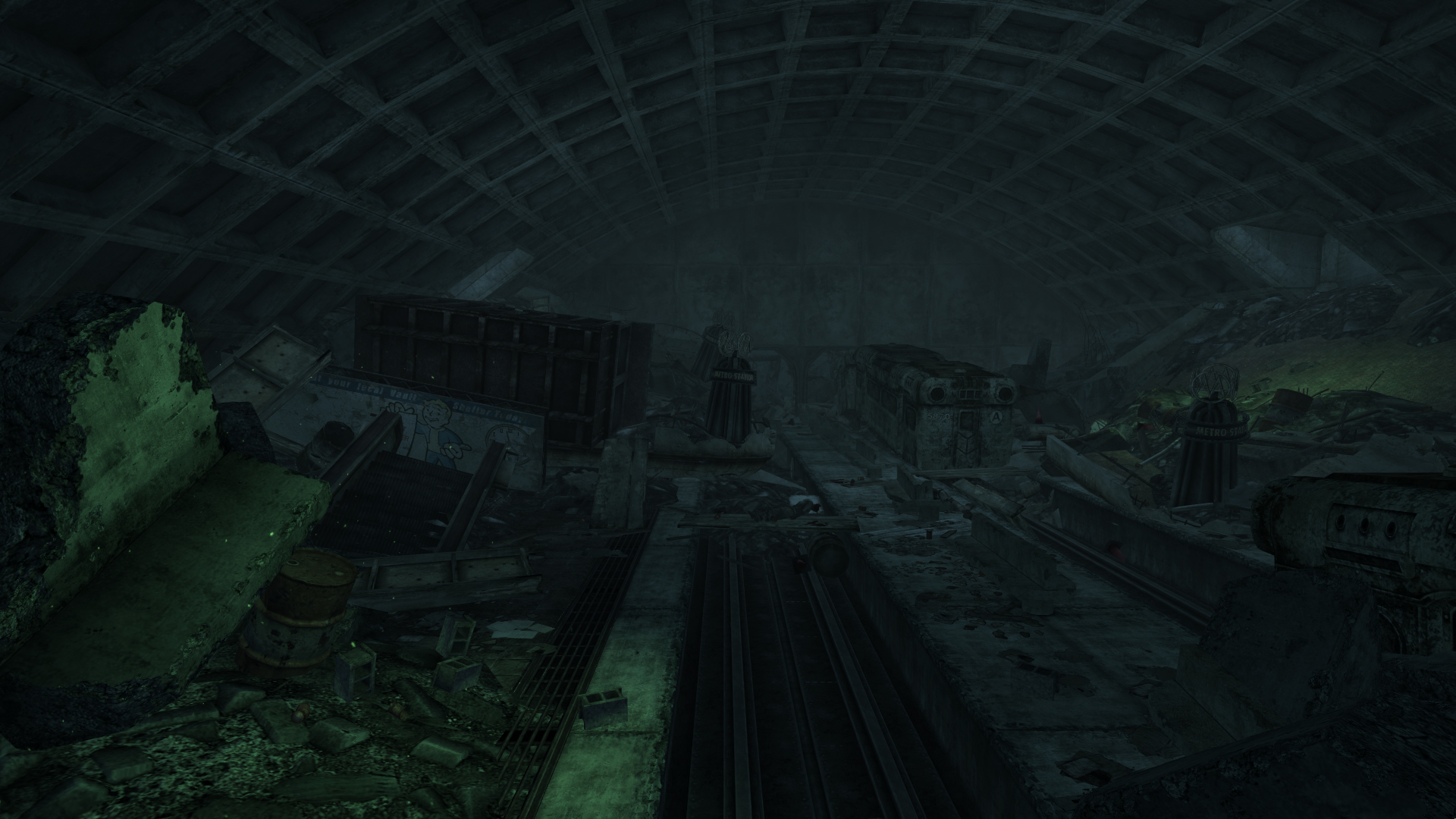 This station's interior is in a state of serious decay and collapse. The area is also partially irradiated, but otherwise poses only a minimal threat from the two feral ghouls in the station that have been feeding on wastelander corpses. Four raiders have also been known to spawn immediately after entering from Falls Church. Subway tracks run east to west. There are only two entrances to the station.