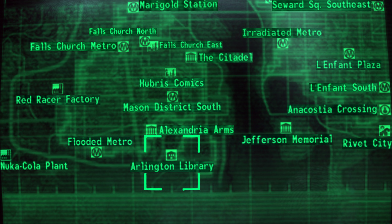 Arlington Library appears in Fallout 3, and is mentioned in Fallout 2,[3] the Fallout 4 add-on Far Harbor,[4] and Fallout 76.[5]