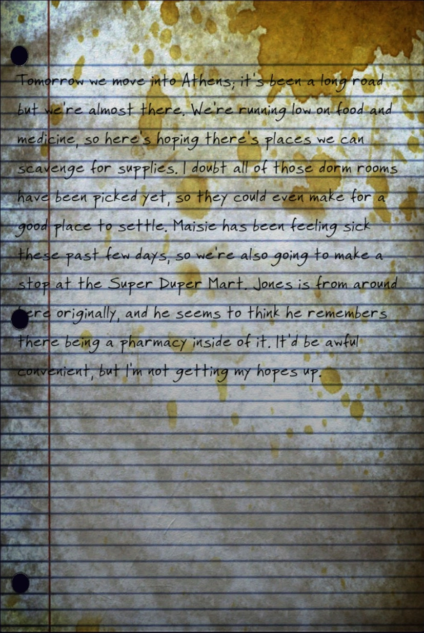 Tomorrow we move into Athens, it's been a long road but we're almost there. We're running low on food and medicine so here's hoping there's places we can scavenge for supplies. I doubt all of those dorm rooms have been picked yet, they could even make for a good place to settle. Maisie has been feeling sick these past few days so we're also going to make a stop at the Super Duper Mart. Jones is from around here originally and he seems to think he remembers there being a pharmacy inside of it. It'd be awful convenient but I'm not getting my hopes up.