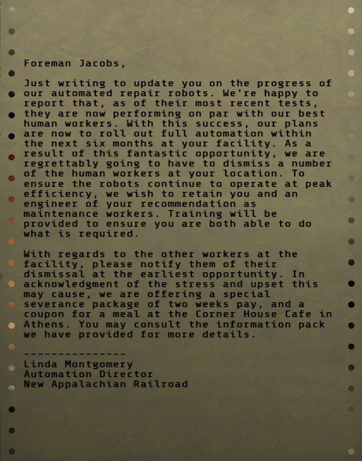 Just writing to update you on the progress of our automated repair robots. We're happy to report that, as of their most recent tests, they are now performing on par with our best human workers. With this success, our plans are now to roll out full automation within the next six months at your facility. As a result of this fantastic opportunity, we are regrettably going to have to dismiss a number of the human workers at your location. To ensure the robots continue to operate at peak efficiency, we wish to retain you and an engineer of your recommendation as maintenance workers. Training will be provided to ensure you are both able to do what is required.