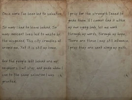 Once more I've been led to salvation. So many I had to leave behind. So many innocent lives laid to waste by the misguided. This city crumbles all around me. Yet it is still my home. And the people left behind are my neighbors. I will stay, and guide whom I can to the same salvation I was granted. I pray for the strength I need to guide them. If I cannot find it within my own aging body, let me work through my words, through my hope. There are those I may still influence. I pray they are sent along my path.
