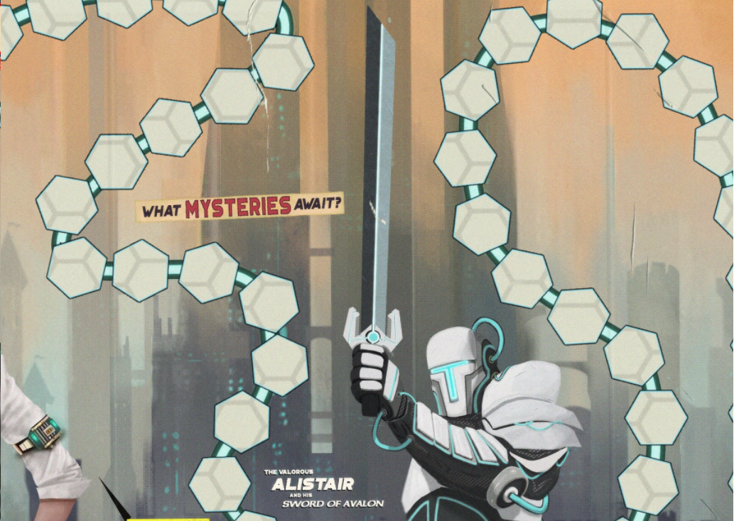 Created by Astoundingly Awesome Tales, Avalon serves as the setting of the board game The Scribe of Avalon. In the game, protagonist time-traveler K.D. Inkwell must locate Cynnoc, "known to history" as the Scribe of Avalon. Along the way, she can be assisted by Alistair, a "legendary Knight of Avalon."[1] The artwork depicting the setting consists of skyscrapers resembling medieval towers, and its inhabitants have to deal with hostile barbarian hordes.[2]