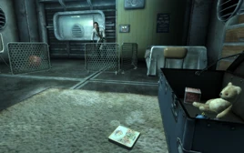 James will come back into the room, aware of their child's escape attempt (even should they return to the pen and close the gate). He will then proceed to read his wife's favorite Bible verse, Revelation 21:6, before having them follow along to see if their friend Amata wants to play. Upon entering into the hallway, the game skips forward nine years to the Lone Wanderer's tenth birthday party, starting the Growing Up Fast quest.