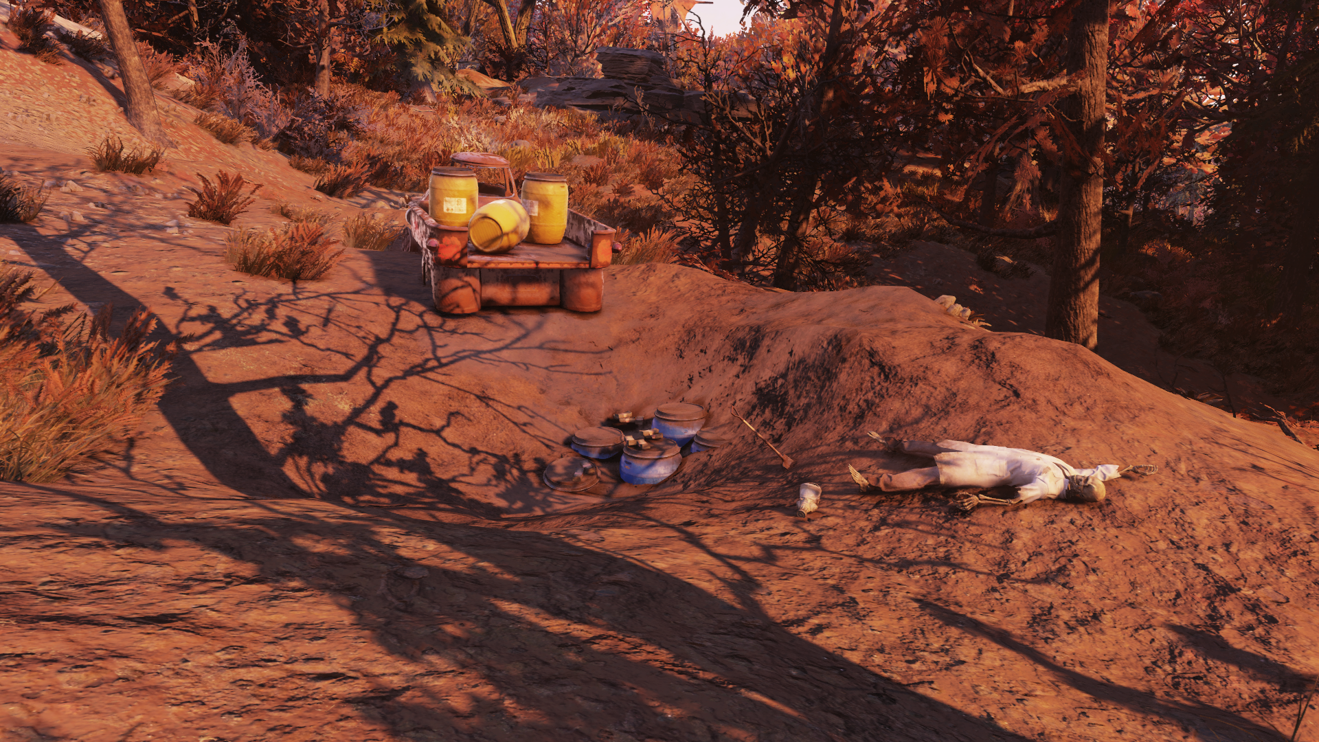 Located just north of Sugar Grove, a scene can be found where a skeleton in a lab coat lays next to a gas mask. Nearby are several partially buried barrels covered in stacks of pre-War money and a shovel. A Pick-R-Up truck is parked nearby, the bed of which contains several more barrels.