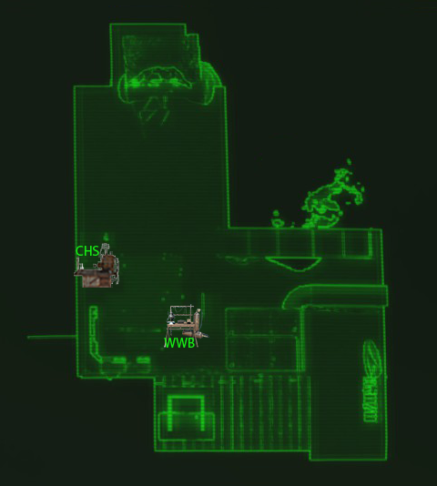 The Novice-locked hatch entrance to the armory is behind a fuel station southeast of the radiant crest shrine. The small basement room contains a chemistry station to determine the recipe of Vim Captain's Blend, a terminal to organize notes on sabotage, and a weapons workbench and firing range to hone the skills needed to intimidate Vim distribution drivers.