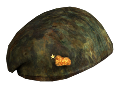 A beret is a soft round cap, usually of wool felt, with a flat crown that tilts to one side. The New California Republic use green berets to identify officers of the New California Republic Army . The beret seems to be camouflaged in various shades of green and brown and has a cap badge of the NCR two-headed bear roaring up at a gold star.