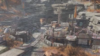 The rail line continues west through the compound, passing under a sign for the Blue Ridge Caravan company and through a second wall. Past the wall is an open area, in the northern part of which lies two power armor stations, a tent containing four beds, a locked armory, and a cooking station. Next to the power armor stations is a raised structure that houses an armor workbench, a weapons workbench, as well as Vinny Costa's terminal.