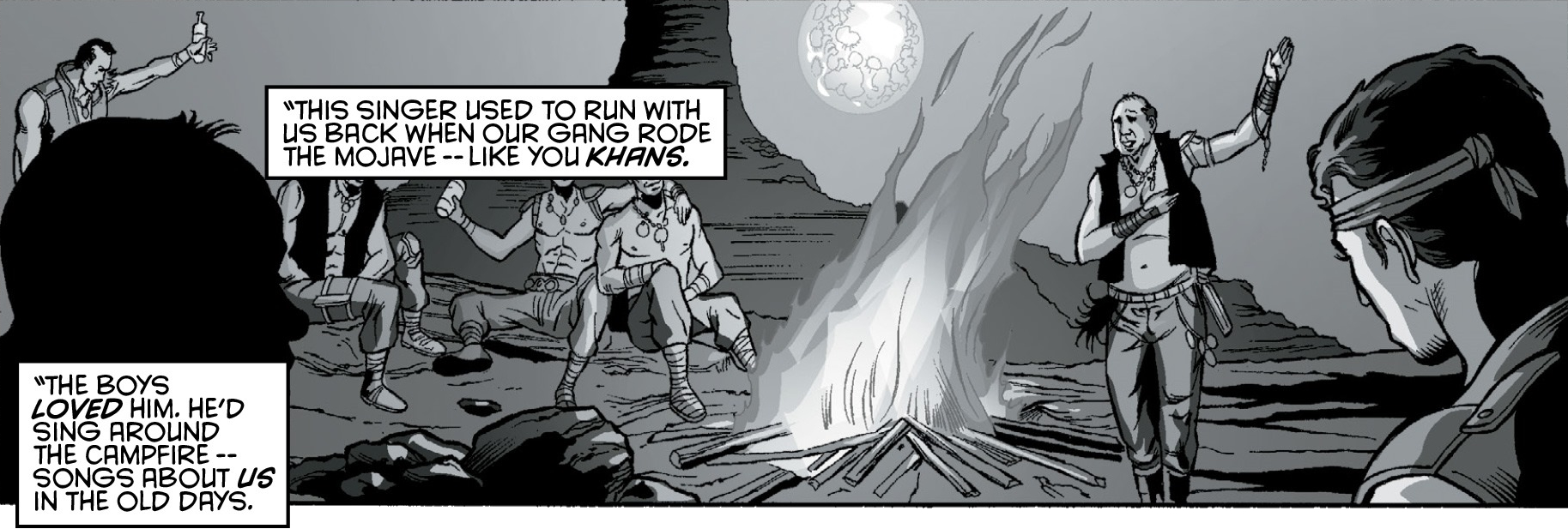 Bingo led the Boot Riders, a nomadic tribe living in the Mojave Wasteland. During the NCR's early expansion into the Mojave area, he and his fellow tribe members were approached by 20 securitrons with Mr. House's offer to assist him in restoring Vegas. Bingo was against House's proposal and wanted the Boot Riders to stay nomadic, but one of the tribesmen, Benny, was intrigued by the offer and wanted to leave the old ways behind.[2]