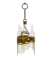 Bottle lanterns are lights made from glass bottles, with a wire wrapped around the outer body. The hanging variant of these bottles are suspended by sealing the lip with steel then attaching them to a link that is fixed to the ceiling with a large steel loop, giving it a small radius from which to swing from.