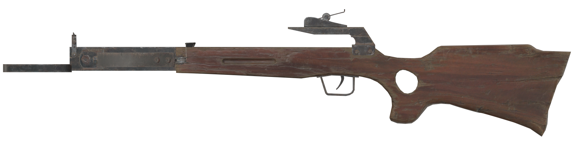 A horizontally-mounted bow with iron sights on a wooden frame. It holds a single crossbow bolt at a time, with the exception of the Nuclear Winter game mode when it holds three.