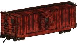 An enclosed railroad car, used to carry freight along pre-War railines across America, typically reddish in color. Three winterized variants with Alaskan markings in various colors including light brown, dark brown, and gray can be found in the Anchorage Reclamation simulation. Another variant clad in brownish color is a common sight on railroad tracks around The Pitt.