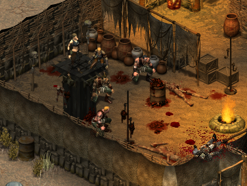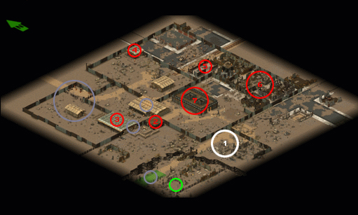 The small building on the south end of the grazing pens, marked with another gray circle, is where the hostages are being held. Two raiders, one armed with a wrench and the other with a Beretta, are watching the two entrances to the building. At this point, switch to single-shot mode on the MP5 and have Stitch grab his Beretta. Freeing the hostages is worth an extra 100 XP. From there, head out through the east door and into a field.