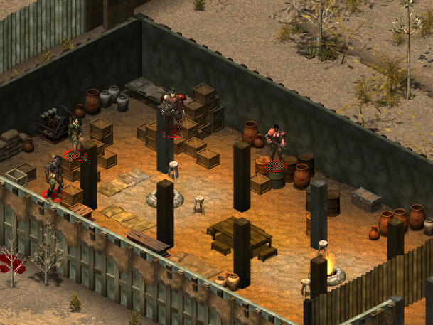 From there, proceed north to a small hut, guarded by a dog. Deal with the dog, then head to the slaughter pens to the northeast, marked with another gray circle. Inside the slaughter pens, there are two dogs and a raider, all asleep. The raider has another shotgun, so either use the time to make aimed shots with the hunting rifle, or a quick shot from one's own shotgun to kill her. From there, head south, into the grazing pens.