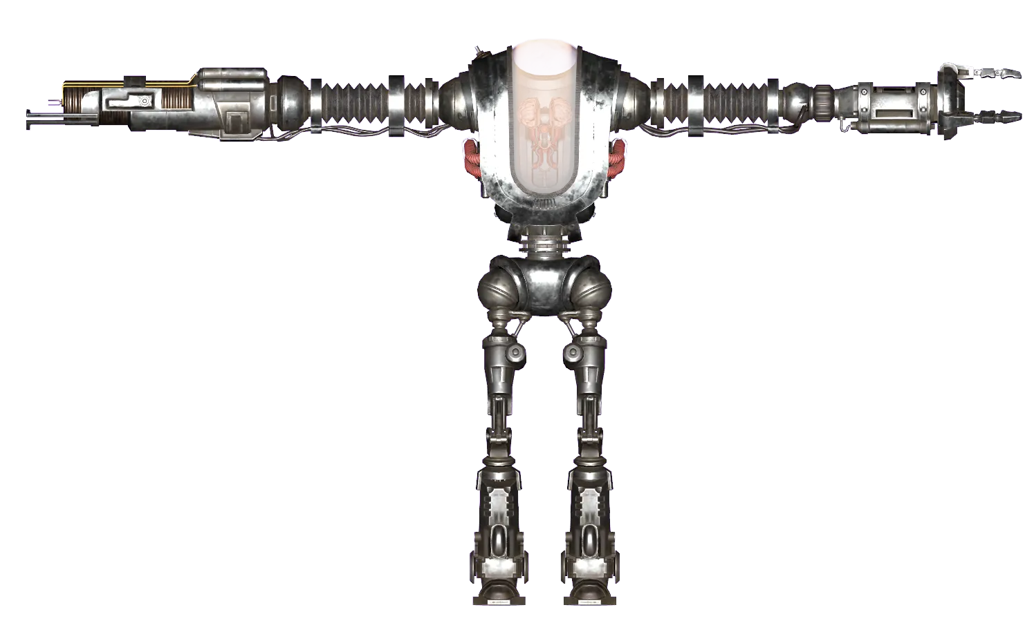 The basic Robobrain model spread throughout the United States vary in capabilities and looks, though the underlying model is largely the same. West Coast Robobrains deployed in The Glow, Sierra Army Depot VI, or the New California Republic were typically provided with human weapons for combat. However, rogue Robobrains that were not sealed in an installation or maintained by human groups usually lack such weapons and rely on their integrated armaments. It is not a general rule, however, as some outfits do not issue weapons to salvaged robots.