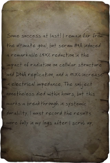 Some success at last! I remain far from the ultimate goal, but serum 87A induced a remarkable 257% reduction in the impact of radiation on cellular structure and DNA replication, and a 153% increase in electrical impedance. The subject nonetheless died within hours, but this marks a breakthrough in systemic durability. I must record the results more fully in my logs after I scrub up.