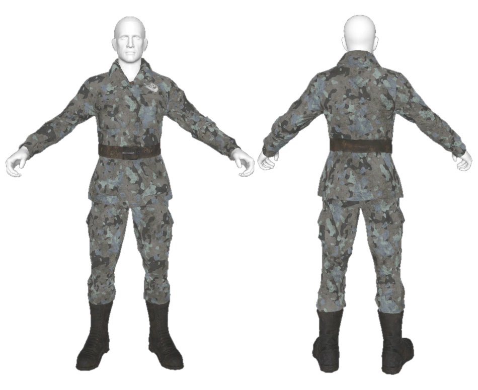 The fatigues are typically worn by members of the Brotherhood of Steel. They consist of a four color digital camouflage pattern printed on pants and a four pocketed field jacket supported around the waist by a leather belt.