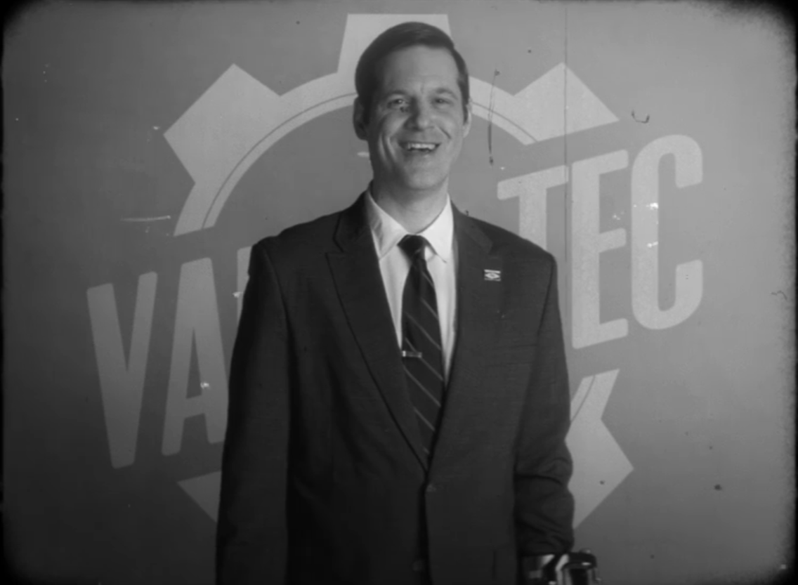 Bud Askins: "You'll never find out. Oh. He's gonna find out. These are Bud's Buds. My Buds. America outsourced the survival of this country to the private sector. But it would have been insane to keep a failed nation alive. So, we kept Vault-Tec alive instead. A well-trained staff of highly supervised junior executives from my own assistant training program. Because the future of humanity comes down to one word: Management."