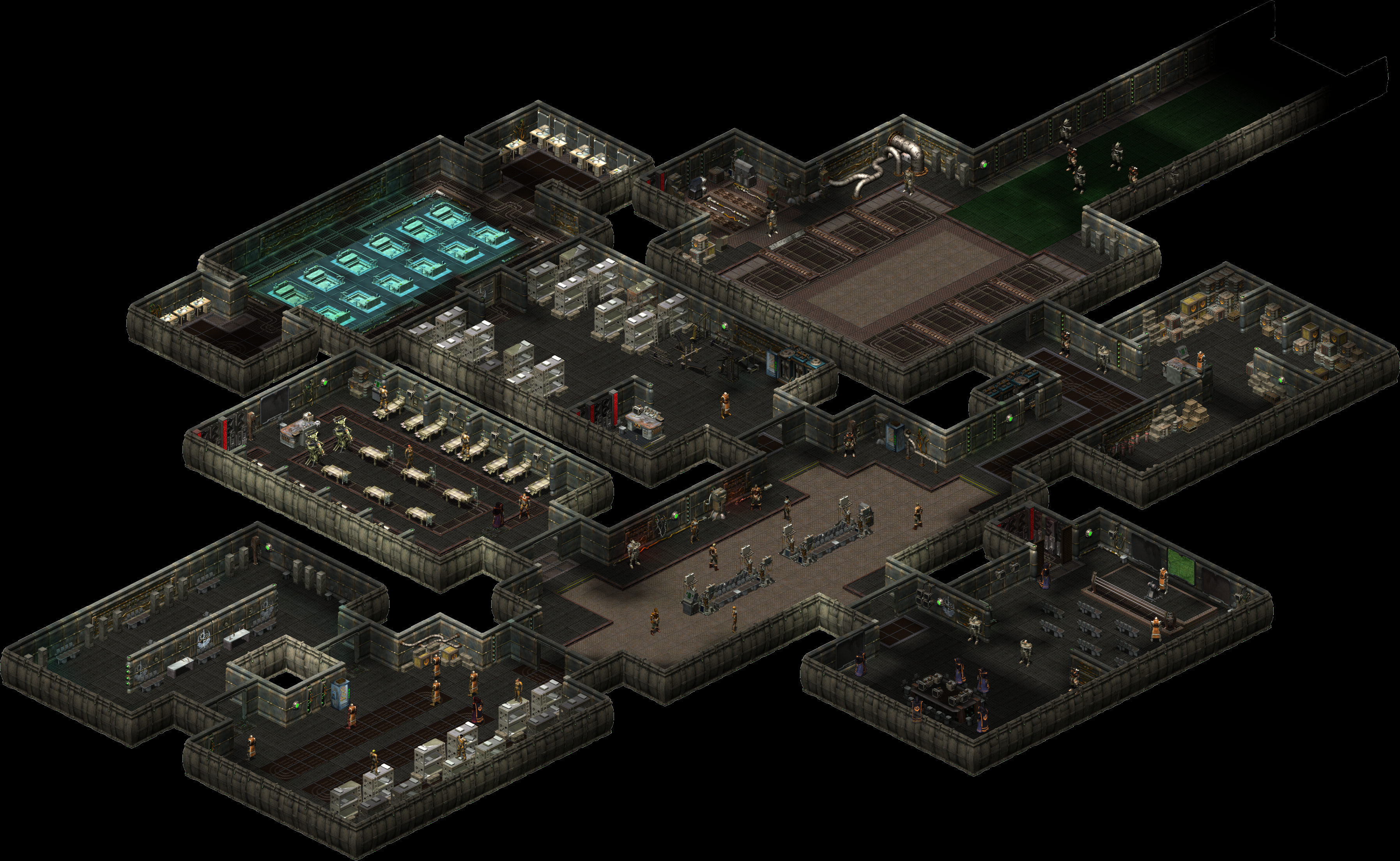 The bunker was inhabited by many paladins, knights, scribes and six elders. Later, tribals arrived as new initiates. The quartermaster of the bunker was Octavius, the recruit master was Personnel Yeoman, and the medical officer was Celsius, who later moved to bunker Beta, being replaced by his assistant, Timothy. The initiates Tiduk and his sister Shauri also presented themselves to the Warrior. Christian could be spotted near the exit. Later, Nanuk, the freed tribal, will appear in the bunker, and a mechanic named Smith will be available for trade.
