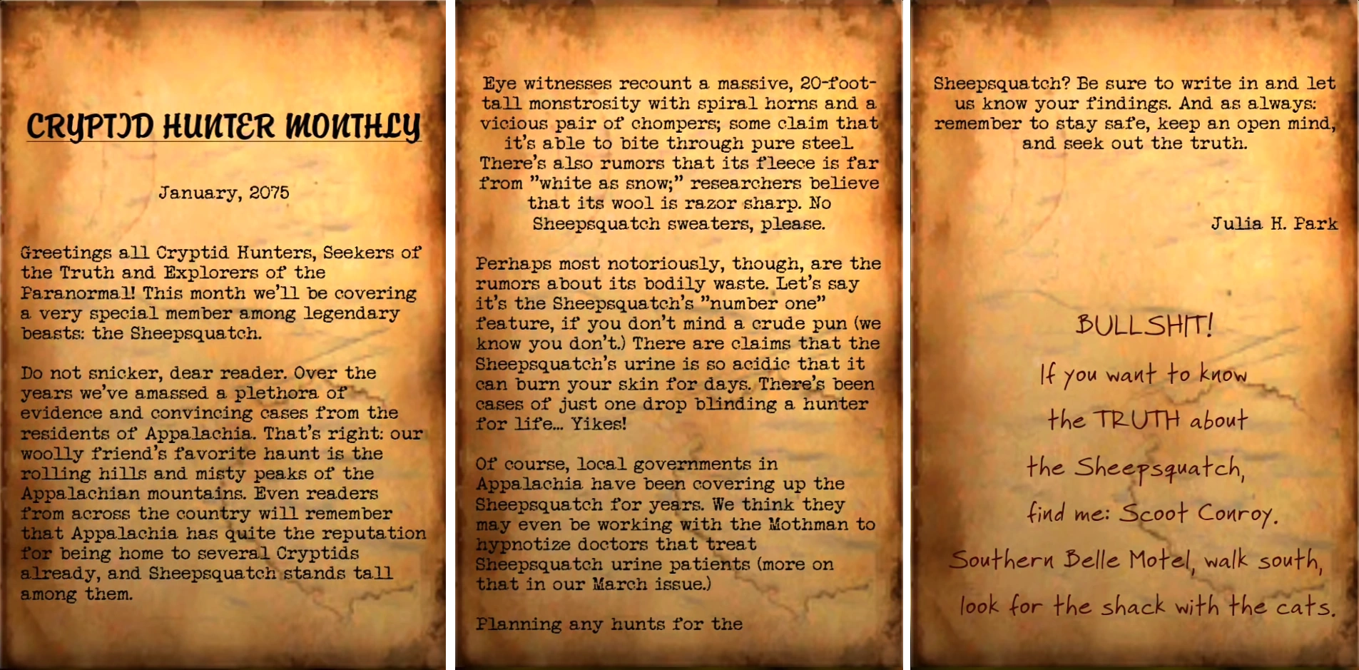C.H. Monthly, January is a paper note in the Fallout 76 update Wild Appalachia. It starts the quest That Sinking Feeling. It is an issue of Cryptid Hunter Monthly.