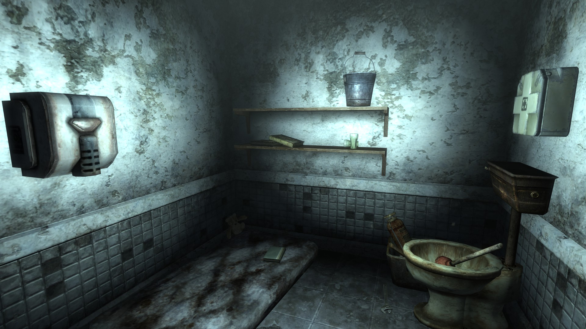 Comprised of a small bathroom with a mattress, toilet, non-operating hand dryer, and a few shelves.