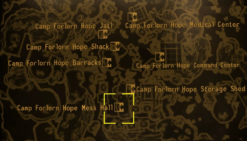 The Camp Forlorn Hope mess hall is an unmarked location within the Mojave Wasteland in Fallout: New Vegas.