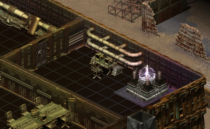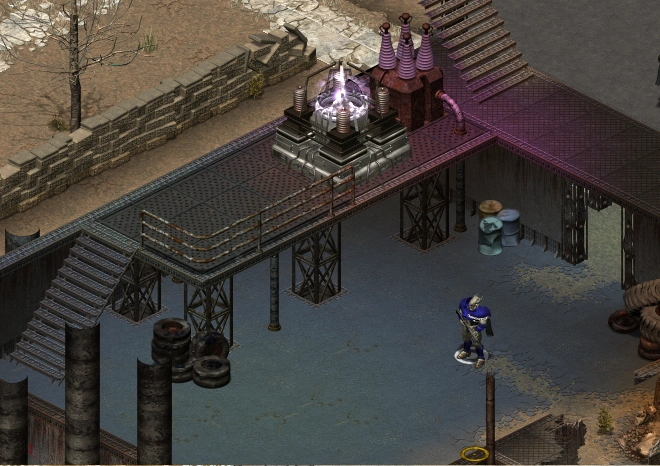 Now leave the building and follow along the bottom side of it between the building and a fence until the Warrior gets to a small gate. Go through the gate and onto the road. Here the Warrior will see a Nuka-Cola plant and a ladder leading below ground. Ignore the ladder for now, as the Warrior will have to come back to it after this node. Enter the building either through the door or the loading bay, either way the Warrior will be met by two security robots. Other than them, the only thing here is the node.