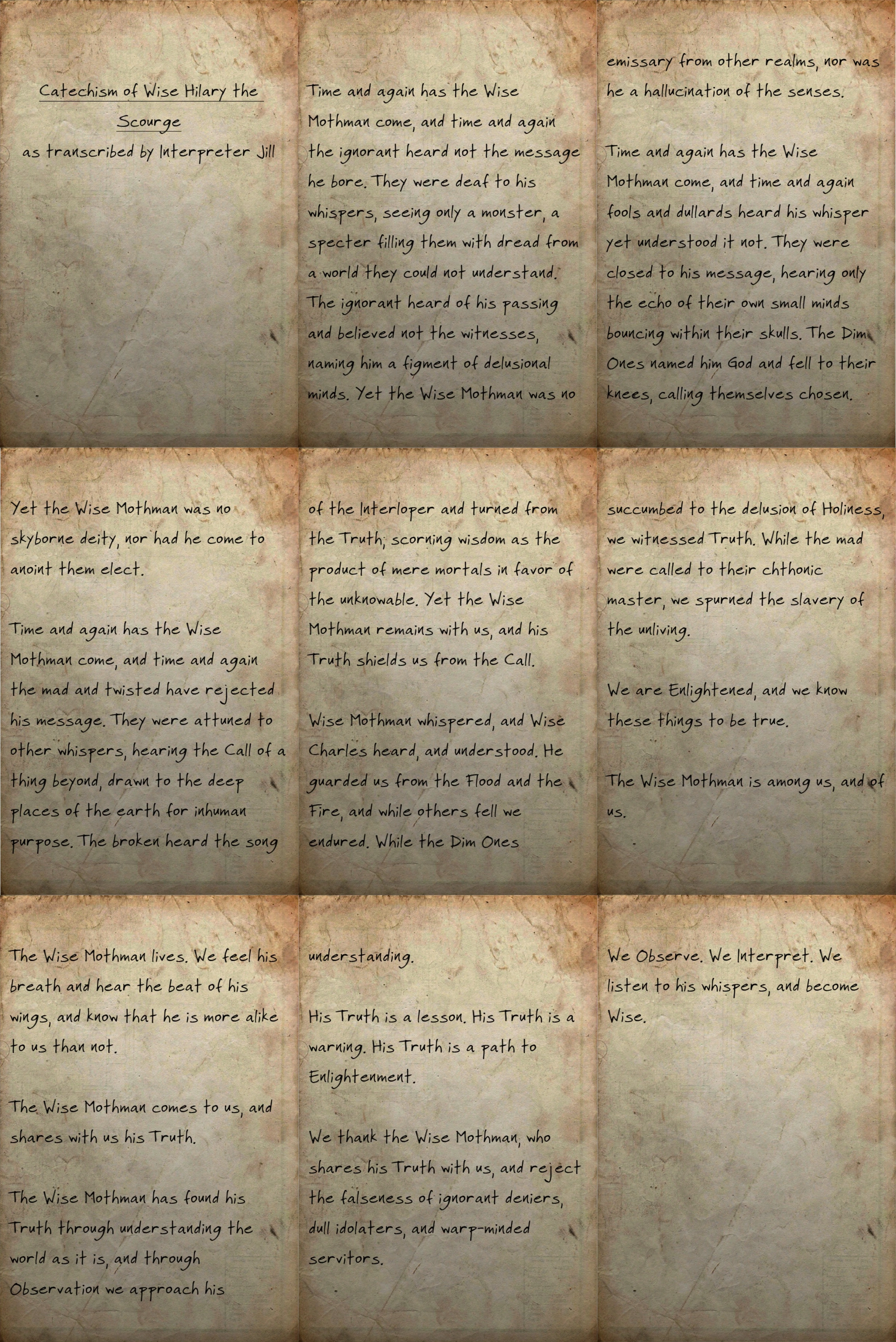 Time and again has the Wise Mothman come, and time and again fools and dullards heard his whisper yet understood it not. They were closed to his message, hearing only the echo of their own small minds bouncing within their skulls. The Dim Ones named him God and fell to their knees, calling themselves chosen. Yet the Wise Mothman was no skyborne deity, nor had he come to anoint them elect.