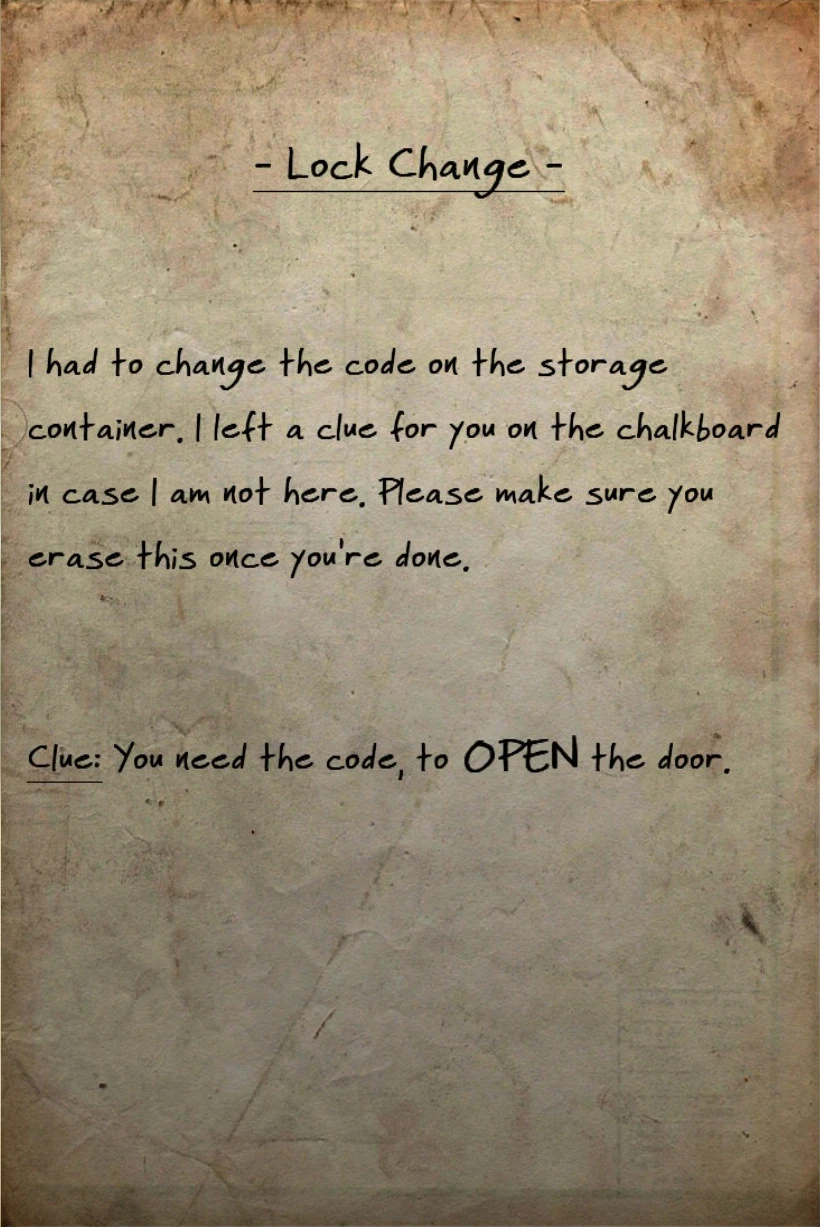 I had to change the code on the storage container. I left a clue for you on the chalkboard in case I am not here. Please make sure you erase this once you're done.