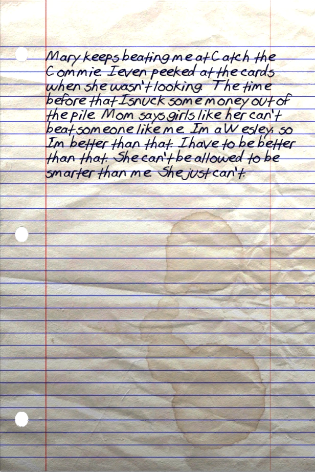 Mary keeps beating me at Catch the Commie. I even peeked at the cards when she wasn't looking. The time before that I snuck some money out of the pile. Mom says girls like her can't beat someone like me. I'm a Wesley, so I'm better than that. I have to be better than that. She can't be allowed to be smarter than me. She just can't.