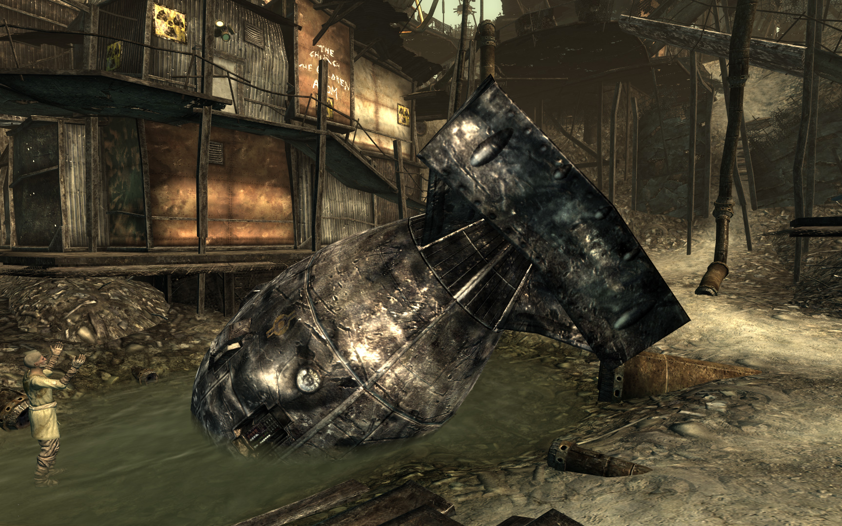 ↑The Lone Wanderer: "So why didn't they move the bomb?" Manya Vargas: "Some of us wanted to. But the Church of Atom was just getting its start then. We needed their help to build the walls and clear the wreckage. If we'd have tried to move the bomb, they would have refused to help. Besides, a lot of people just wanted to leave it alone. It didn't seem to be hurting anything and who knows what would happen if we messed with it." (Manya Vargas' dialogue)