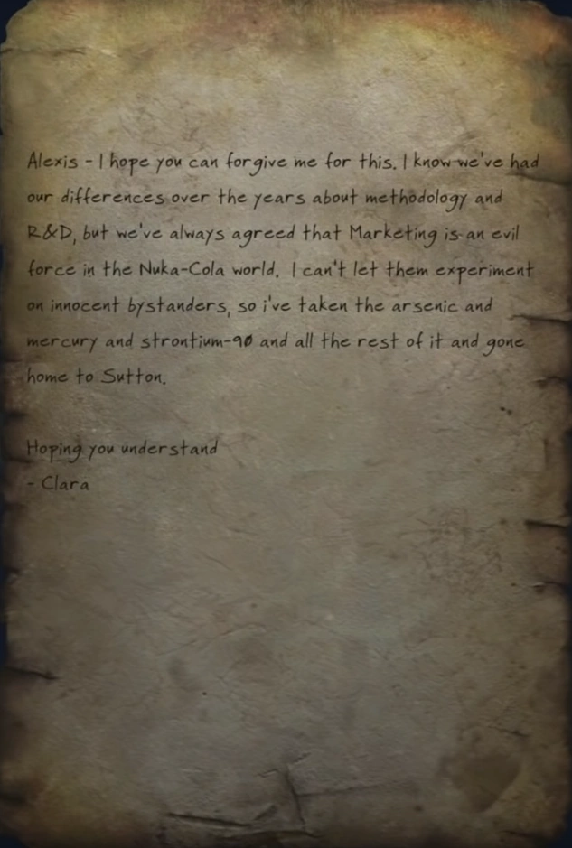 Alexis - I hope you can forgive me for this. I know we've had our differences over the years about methodology and R&D, but we've always agreed that Marketing is an evil force in the Nuka-Cola world. I can't let them experiment on innocent bystanders, so I've taken the arsenic and mercury and strontium-90 and all the rest of it and gone home to Sutton.