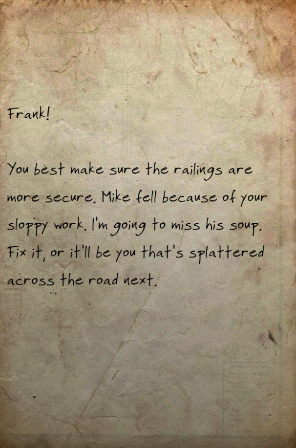 You best make sure the railings are more secure. Mike fell because of your sloppy work. I'm going to miss his soup. Fix it, or it'll be you that's splattered across the road next.