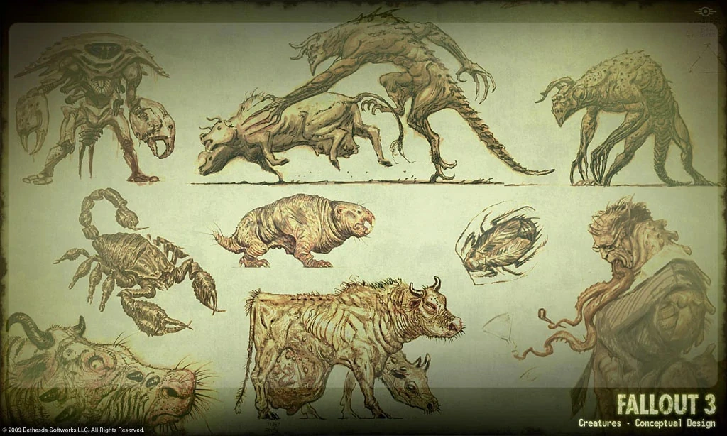 To say I have kindred spirits here at Bethesda in that factor is a vast understatement. The attention to detail is unrelenting to the point of exhaustion. It is always worth it to see the end product of those hours of debate and obsessing when a world comes together. Even with the inevitable hitches and lurches I can still see through the emerging racecar through the primer paint, so to speak. The process is exciting, fun and highly collaborative. All of the designs evolve through contributions from the whole team, I like to feel that it's my job to instigate the process with a cool drawing that inspires everyone else here into making something really cool, and worth the effort. That being said, I'll start talking monsters.