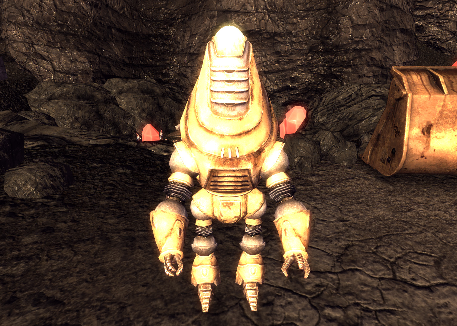 Located at the construction site, this unique Protectron is painted yellow and is outfitted with a modified head, reminiscent of a miner's hat with a headlamp. It is hostile and has health equal to that of a Protectron Mk 6, making it a formidable opponent.