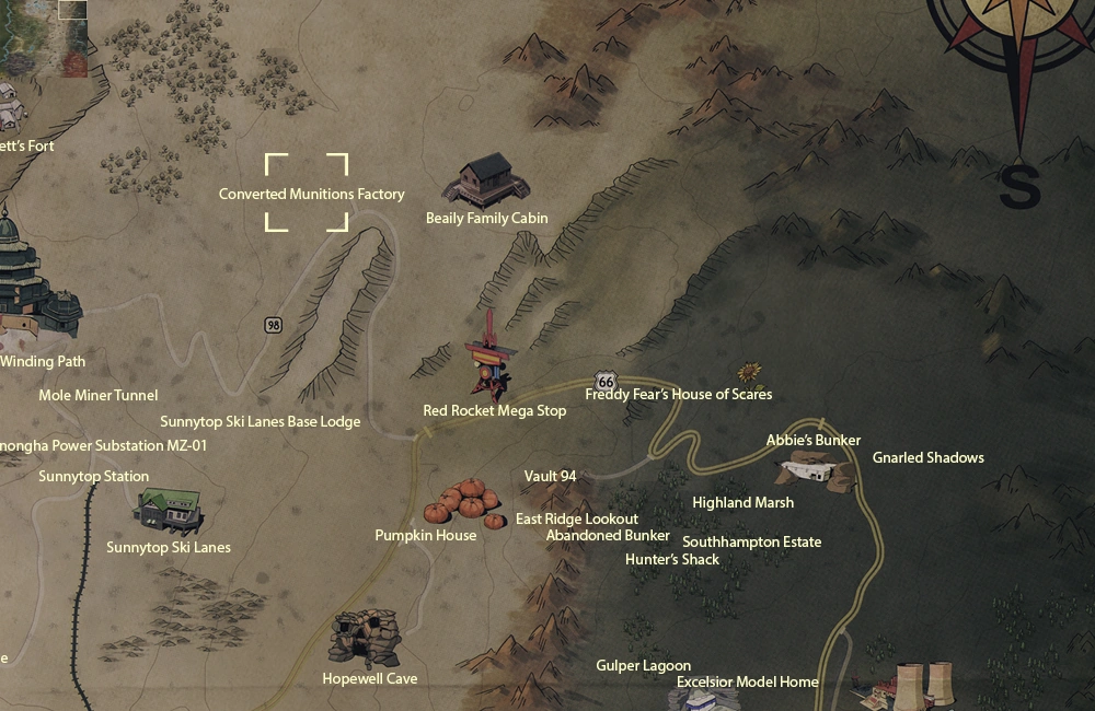 This former Radiation King assembly plant is located in a secluded corner of the Savage Divide. Outside, there's a small Vertibot landing pad next to a parking area that spawns a level 50 vertibot to defend the factory alongside the three heavy gun emplacements. The factory floor can be accessed by entrances on the northern and southern sides of the building. The factory is a workshop settlement and offers food (7), water (8), as well as junk, ammo, silver, lead, aluminum, and oil resource nodes (1 each).
