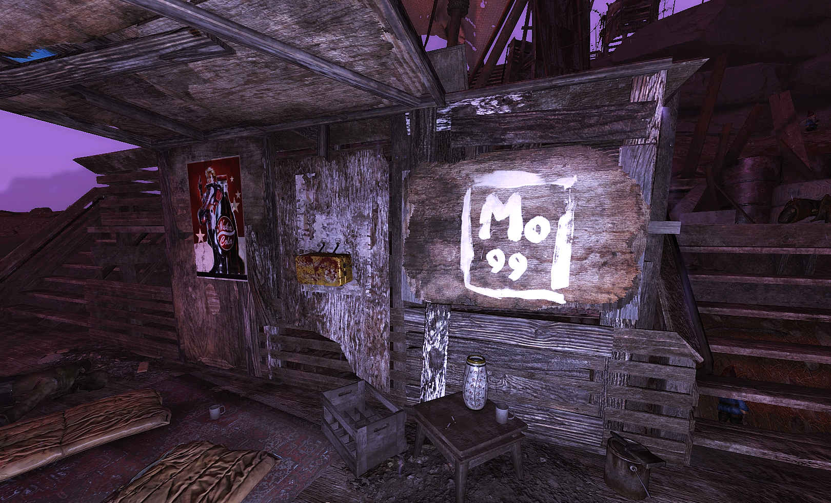 Outside of the plant, there is a gated parking area filled with army vehicles. To the west is a Vertibot landing pad with a crate of Vertibot signal grenades. There are oil, silver, lead, aluminum and junk deposits here, though the most notable resource is the ammunition plant inside on the first floor. If it is powered up through either a generator or the power box linked to the Monongah Power Plant, the plant can produce a wide variety of ballistic and energy ammunition types by selecting the desired ammo on an adjacent terminal. Also on the first level, on the eastern side, is a generator room that has an armor workbench and a fusion core. The second floor holds the supervisor's office, as well as a mostly empty break room to the east. Next to that is another room where the assembly line begins.