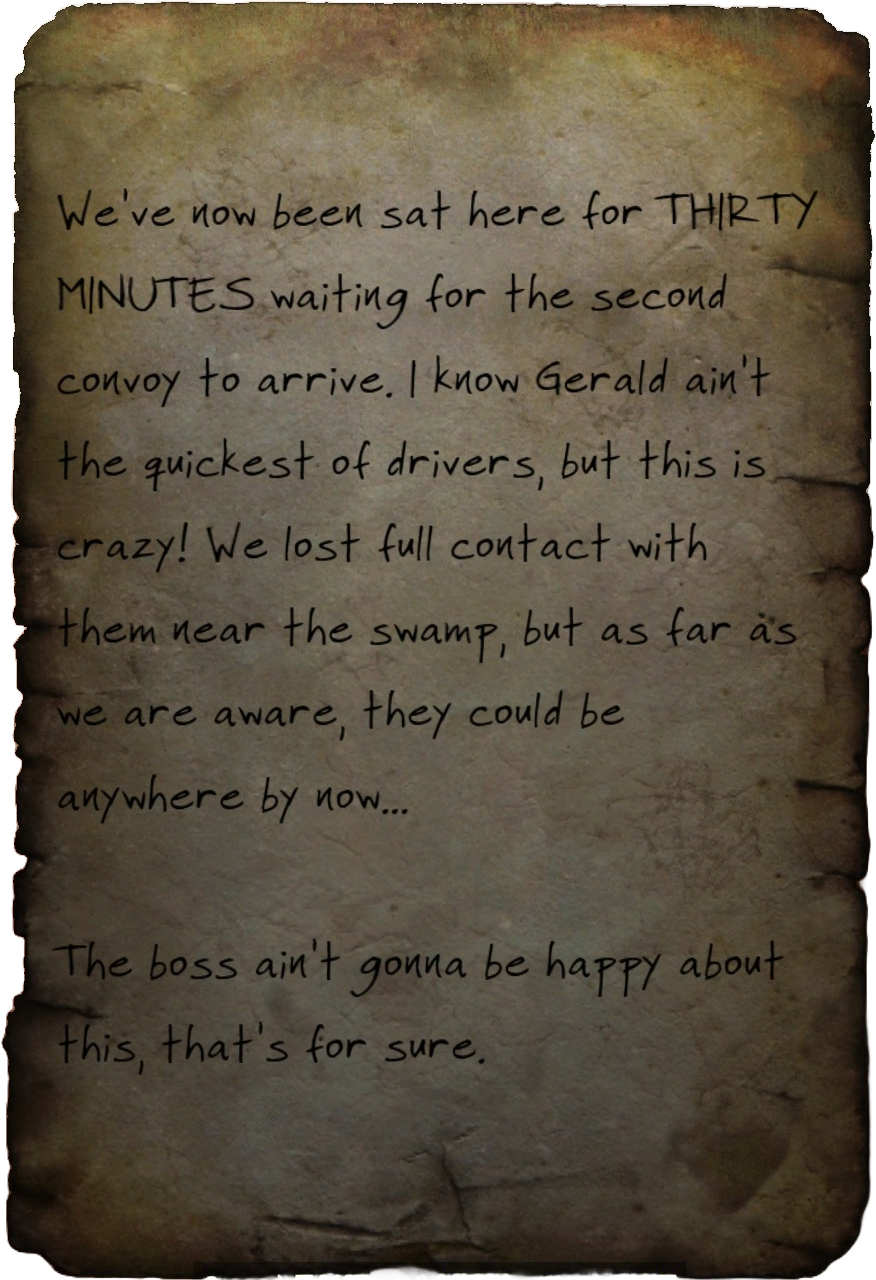We've now been sat here for THIRTY MINUTES waiting for the second convoy to arrive. I know Gerald ain't the quickest of drivers, but this is crazy! We lost full contact with them near the swamp, but as far as we are aware, they could be anywhere by now...