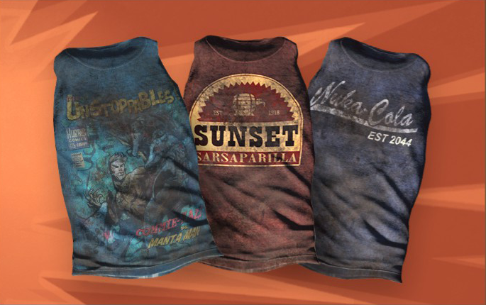 Show off your Fallout branded attire with over 25 t-shirts and pants. Brands include Nuka-Cola, Red Rocket, Vault-Tec and several of your favorite Hubris comics and more |