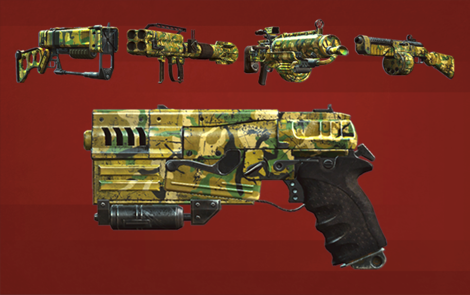 With its mottled yellow, brown and green, the swamp camo Pip-Boy paint job is perfect for those waterlogged slogs through Bloodbug-infested terrain | |||