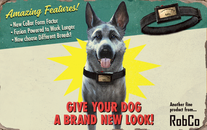 The TransDOGrifier collars are special collars that change Dogmeat's appearance. Choose from 4 new visual styles. If you have purchased any other dog Creation, you can also select that breed of dog for Dogmeat, as well. | Deposited into your inventory, crafted at chem stations and modified at armor workbench. | 300 | |