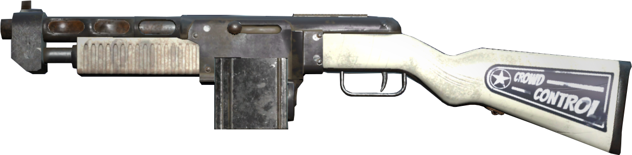 The Crowd Control is a variant of the combat shotgun . Visually, it has a white stock and handguard with the stock bearing a blue insignia decal with a star and the words "Crowd Control." This decal is stamped on both sides of the shotgun's stock. The Crowd Control comes with the Explosive, Suppressor's and Lightweight Legendary effects .
