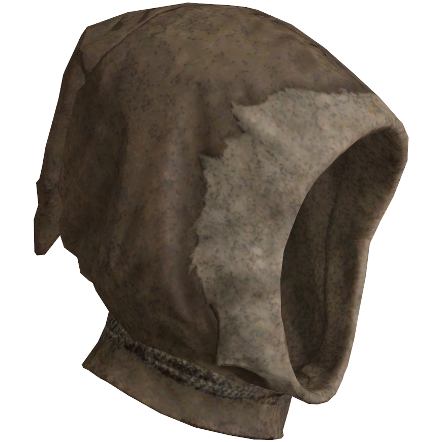 Ragged and handmade in appearance, the outfit consists of all brown pants, a knee length tunic, boots and fingerless gloves. The helmet is made from a two tone brown material that covers most of the head.