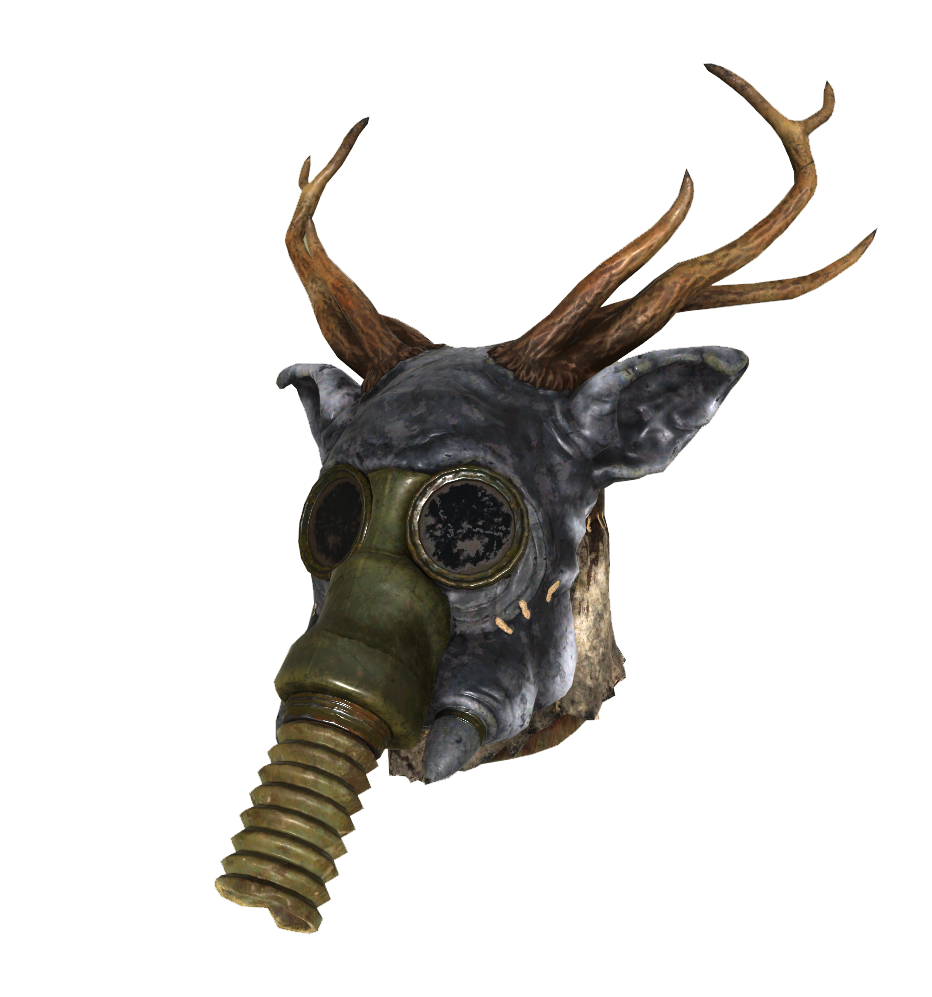 A gas mask decorated with antlers and treated parts of a pig's head, representing an incarnation of something the Cult of the Mothman believe in. A limp hanging tube forms the muzzle, perhaps suggesting the snout of a tapir or similar creature.