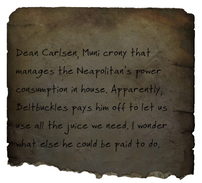 Dean Carlsen, Muni crony that manages the Neapolitan's power consumption in house. Apparently, Beltbuckles pays him off to let us use all the juice we need. I wonder what else he could be paid to do.