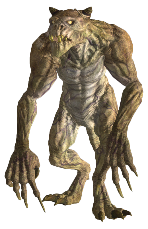 So here's what happened: the newly formed Black Isle started work on what would be Planescape: Torment. One of the first art pieces was a monstrous creature called a Tarrasque. It was sculpted in clay and was then point-by-painstaking-point digitized into a 3D model. As Planescape moved forward, it turned out that the Tarrasque wouldn't actually be featured in its design, leaving that tasty model in disuse. Thus, the furry wolverine-bear became a hairless reptilian biped. (Take a look at page 339 of the D&D second edition Monster Manual. Holy cats! It's a Deathclaw!)”— Scott Campbell, Origins of Fallout No Mutants Allowed