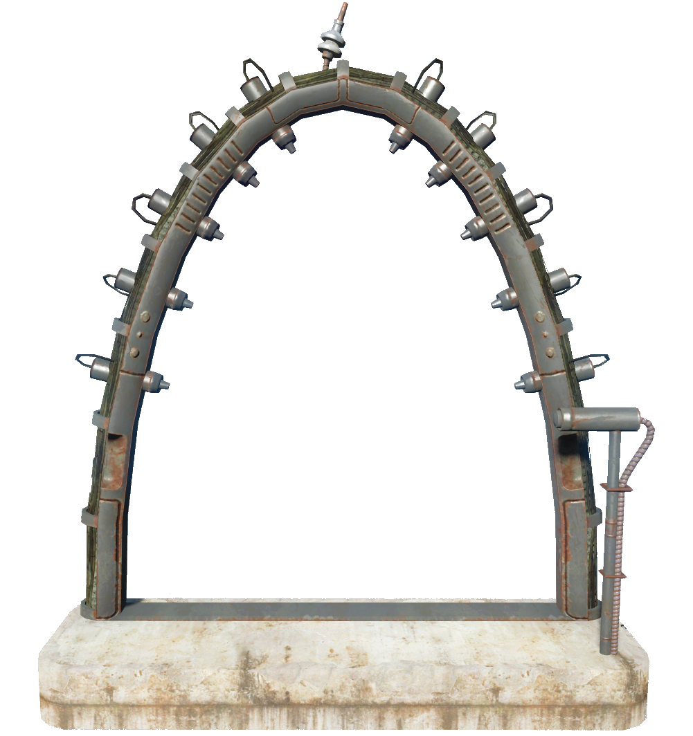 The decontamination arch is a settlement object that, when powered and switched on, removes all radiation from the player character when they pass through it, along with healing all damage at an extremely slow rate. It can be constructed at any friendly settlement, and requires two units of power to function. Its built-in switch[1] can be used to activate and deactivate it, so it does not require an external switch.