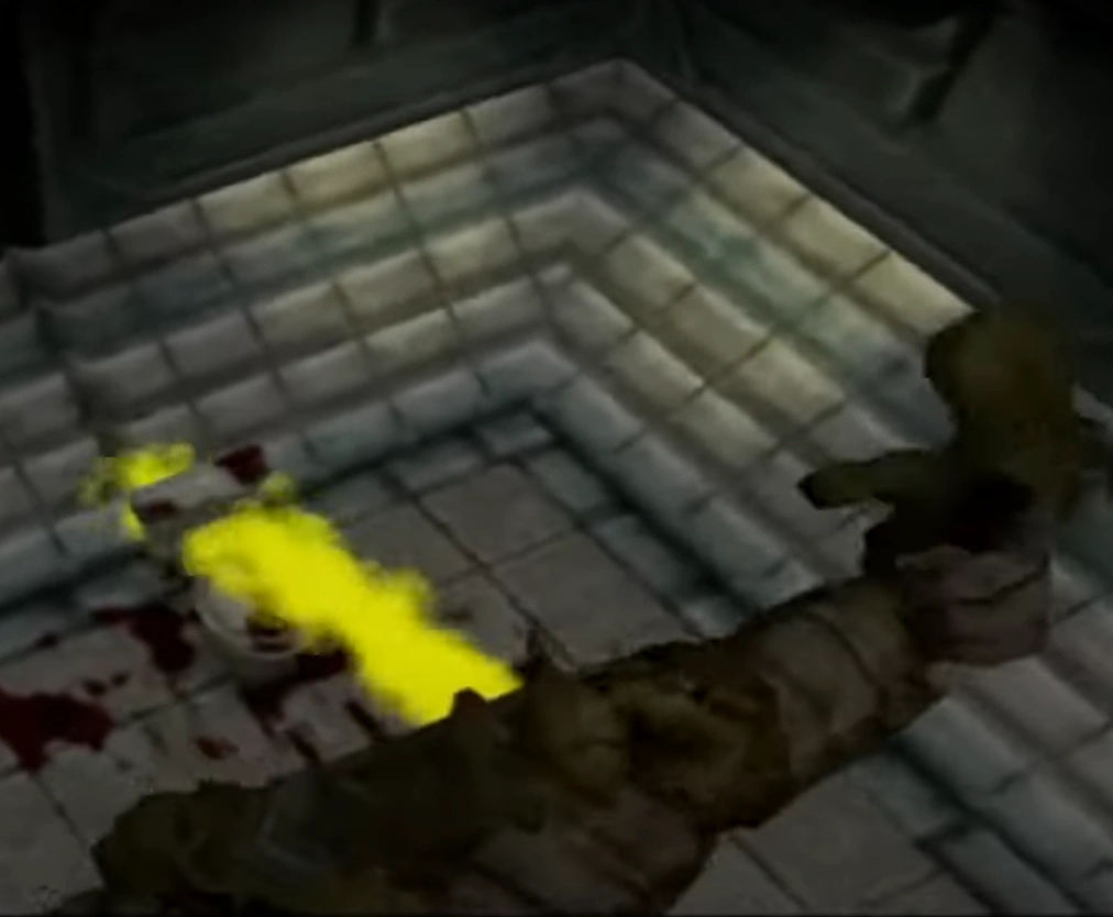 ↑The Vault Dweller: "{163}{}{What's this place used for?}" Dane: "{170}{}{This is the baptismal. They make Servitors here. When acolytes have been indoctrinated, they bring them here and they go through the process. A few of them survive . . .}" "{171}{}{Most lose their minds, but they're still useful. They throw them downstairs, rant at them about the Master and walk around in a stupor. You've seen the zombies. Great slave labor -- and soldiers . . .}" "{172}{}{John Brown's body is molderin' in the Grave. John Brown's body is molderin' in the Grave, John Brown's body is a-molderin' in the Grave, and the Master's screwing us overrrrr . . .}" "{173}{}{Stop that. It's getting real difficult to hold myself together.}" "{179}{}{Ooops! I can't keep myself together anymore! Whee! Whee! Whee!}" (Dane's dialogue)