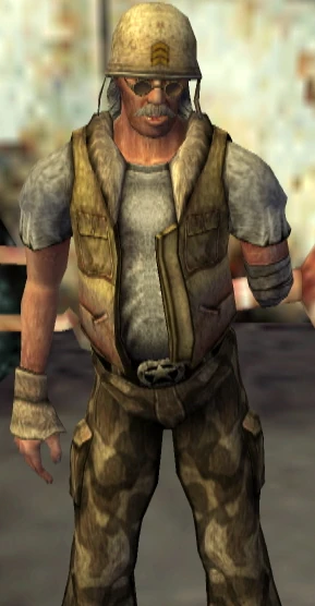 No-bark Noonan is a manic conspiracy theorist who suffers from symptoms similar to paranoid schizophrenia, with his condition implied to be the result of a traumatic brain injury.[31] "No-bark" is a derisive nickname given to him by the residents of Novac, based on an idiomatic description of mental disability ("not all of your dogs are barking"),[32] though No-bark embraces the nickname and interprets it instead as referring to how his theories and observations "ain't just barking."[31] No-bark is known to treat inanimate objects as though they were people,[33][34] as well as animals and (in cut caravan dialogue) their "spirits."[33][35] He also believes himself to be under constant surveillance by unspecified parties.[36][37] Despite his delusions, No-bark is extremely perceptive and has witnessed many important events around Novac that others haven't, including Carla Boone's abduction by Caesar's Legion,[38] the attacks on Dusty McBride's cattle by a minigun-armed nightkin,[39] and the presence of more nightkin at the REPCONN test site.[40] These observations, though heavily distorted by his delusional worldview, provide potentially vital clues to the player in Novac's sidequests.