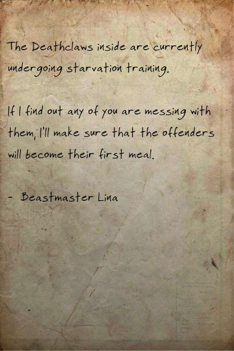 Don't feed the deathclaws! is a paper note in Fallout 76, introduced in the Burning Springs update.